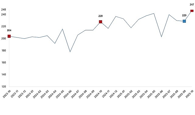 Bir önceki ay 228 bin 846 ton olan tavuk eti üretimi Ekim ayında %8,1 oranında artarak 247 bin 392 ton oldu.